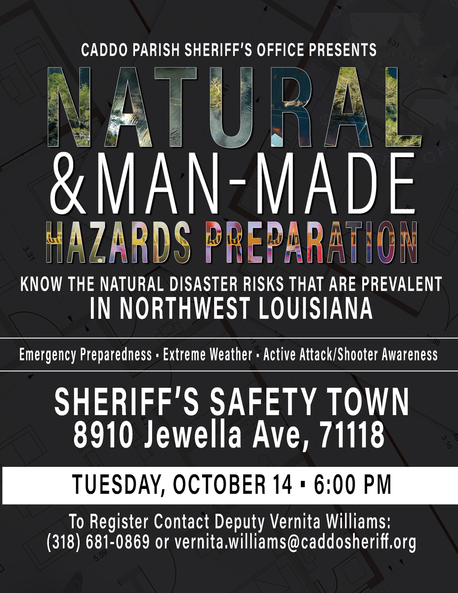Join Caddo Sheriff's Lieutenant Tony LeBlanc on Tuesday, October 14, at 6 p.m. for a Natural and Man-Made Hazards Preparation Workshop at Sheriff's Safety Town, located at 8910 Jewella Ave, Shreveport, LA. This event is designed to equip Caddo residents with the essential knowledge and tools they need to prepare. While we cannot avoid disasters, we can take steps to minimize their impact, protect our families and property, and empower our communities to recover and rebuild.