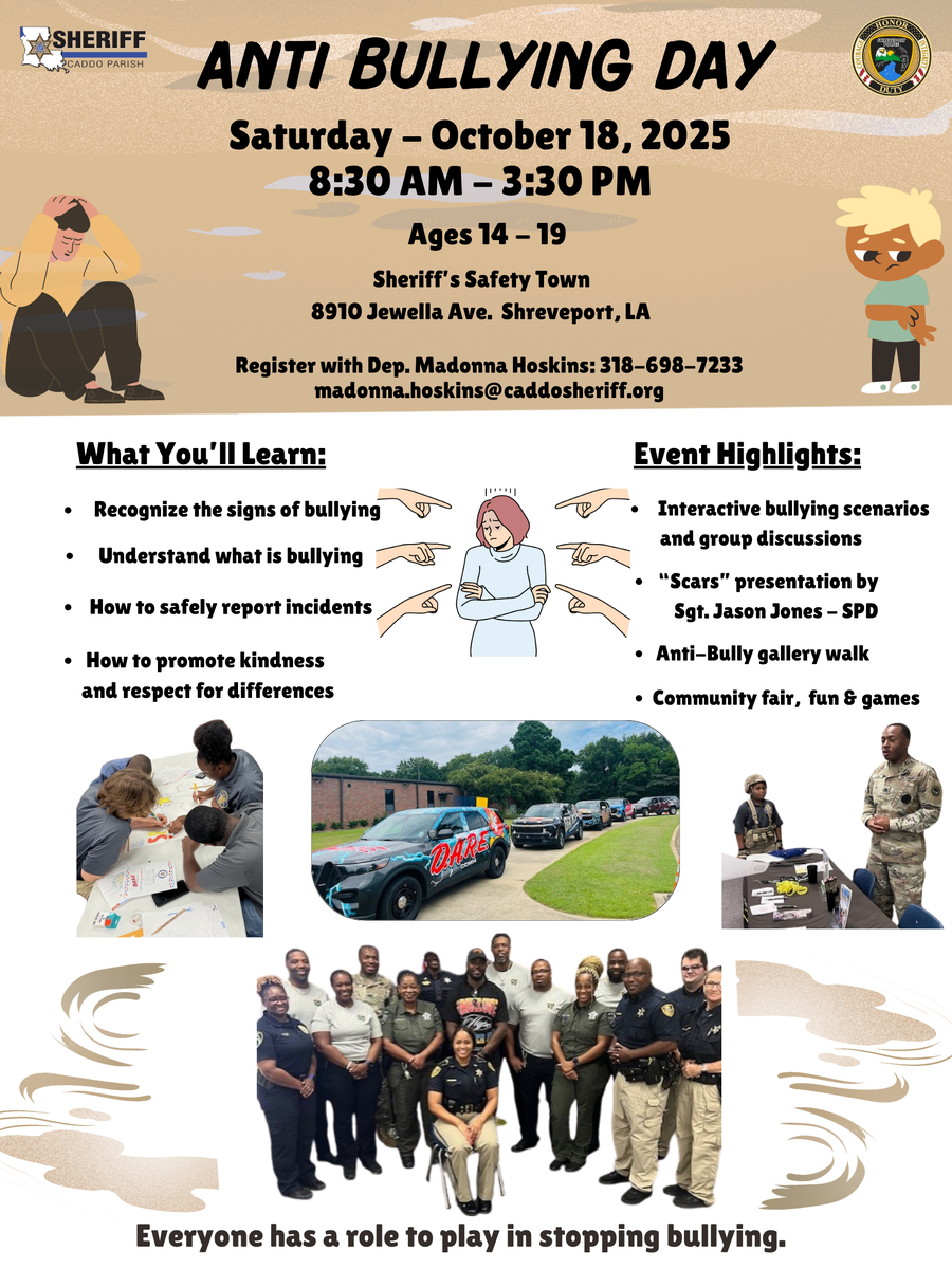 The Caddo Parish Sheriff’s Office is inviting teens to take a stand against bullying by attending Anti-Bullying Day on Saturday, October 18, 2025, from 8:30 a.m. to 3:30 p.m. at Sheriff’s Safety Town, located at 8910 Jewella Avenue in Shreveport.