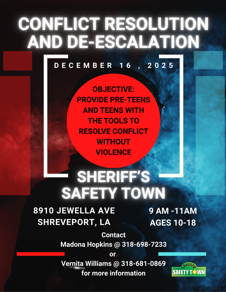 The Caddo Parish Sheriff’s Office will host a Conflict Resolution and De-Escalation Workshop for youth ages 10 to 18 on Tuesday, December 16 from 9 to 11 a.m. at Sheriff’s Safety Town, 8910 Jewella Ave., Shreveport, LA 71118.