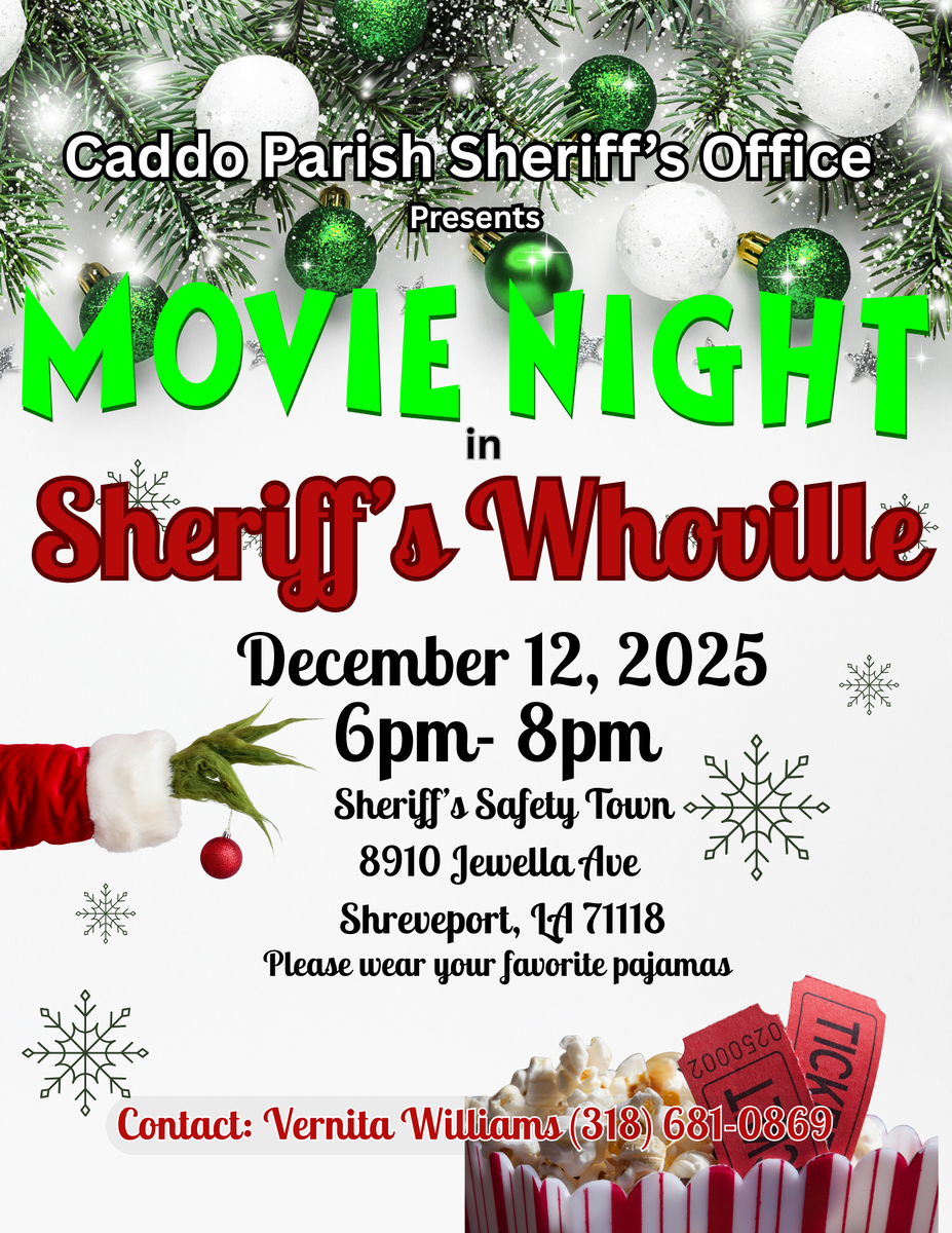 The Caddo Parish Sheriff’s Office is inviting families to wear their favorite pajamas for Movie Night in Sheriff’s Whoville on Friday, December 12, from 6 to 8 p.m. at Sheriff’s Safety Town, 8910 Jewella Avenue, Shreveport, LA 71118.