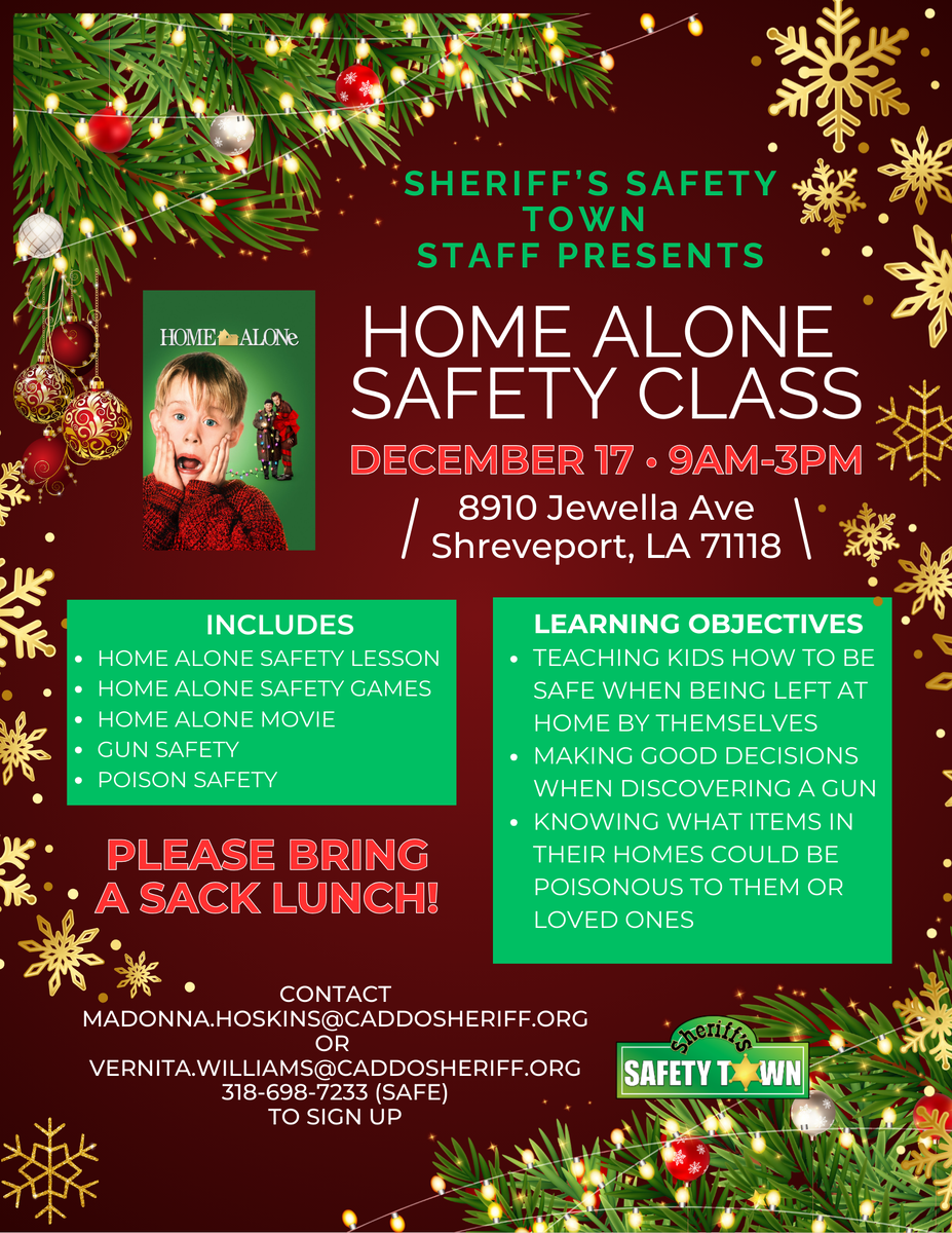 The Caddo Parish Sheriff’s Office is offering parents an opportunity to equip their children with critical safety skills by having them attend a Home Alone Safety Class on Wednesday, December 17 from 9 a.m. to 3 p.m. at Sheriff’s Safety Town, 8910 Jewella Ave., Shreveport, LA 71118.