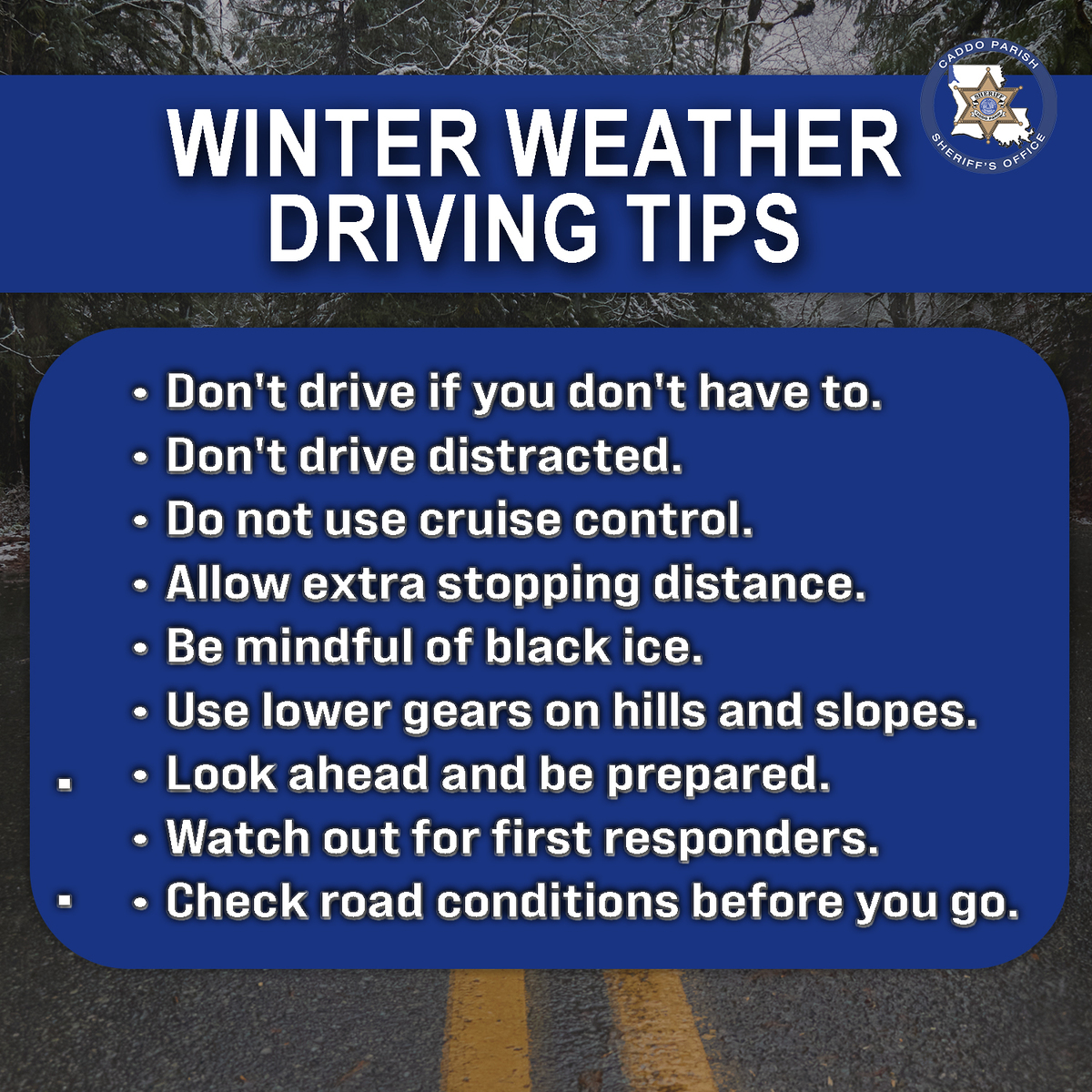 The Caddo Parish Sheriff's Office appreciates the public's cooperation and encourages everyone to take these precautions seriously. A few simple steps can prevent crashes, injuries, and save lives.