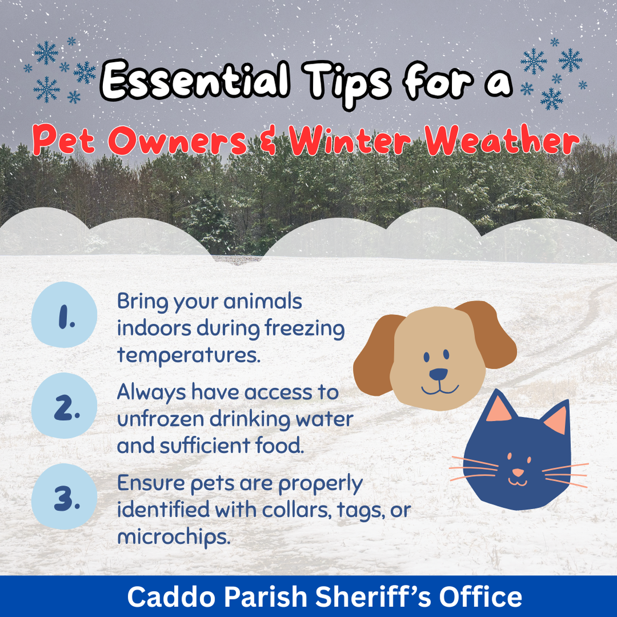 As winter weather impacts our area, Caddo Parish Sheriff Henry Whitehorn Sr. reminds residents to take extra precautions to keep their pets safe from cold temperatures and hazardous conditions.