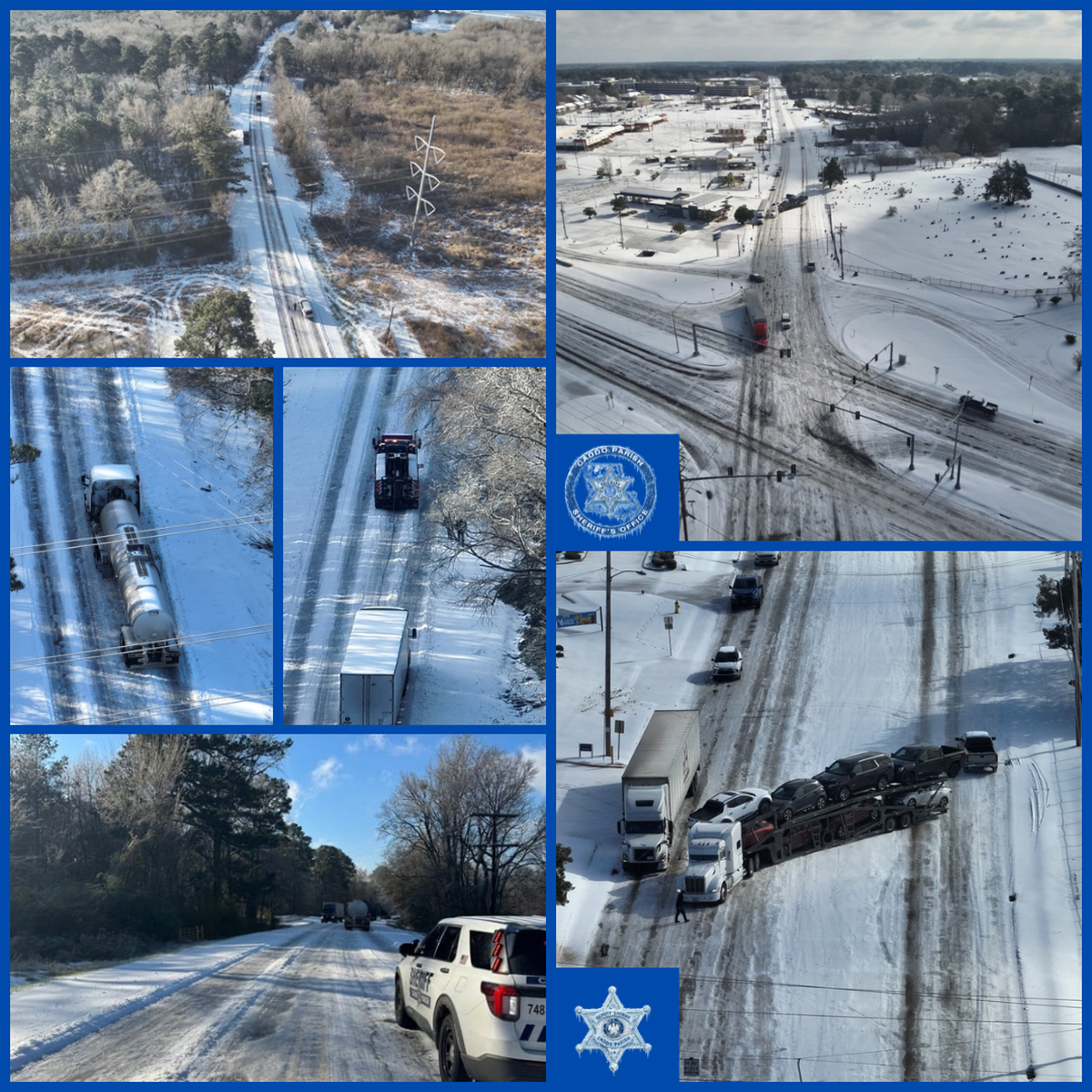 Aerial footage from the CPSO Drone Unit from this morning shows widespread impacts across Caddo Parish following Winter Storm Fern. With temperatures expected to remain below freezing for several days, hazardous icy conditions will persist on roadways, especially on residential streets and rural routes. Motorists are urged to use extreme caution when traveling. If travel is not necessary, please remain at home and avoid driving.