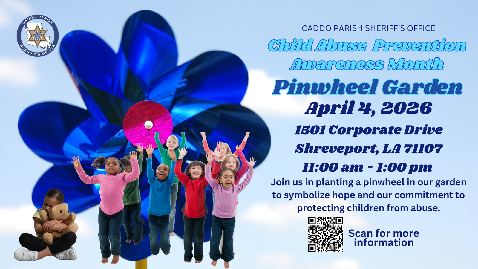Community members are encouraged to join families and law enforcement at the Pinwheel Garden Awareness event in recognition of Child Abuse Prevention Month. The event will take place Saturday, April 4 from 11 a.m. to 1 p.m. at the Caddo Parish Sheriff’s Office Community Relations Office, located at 1501 Corporate Drive in Shreveport.
