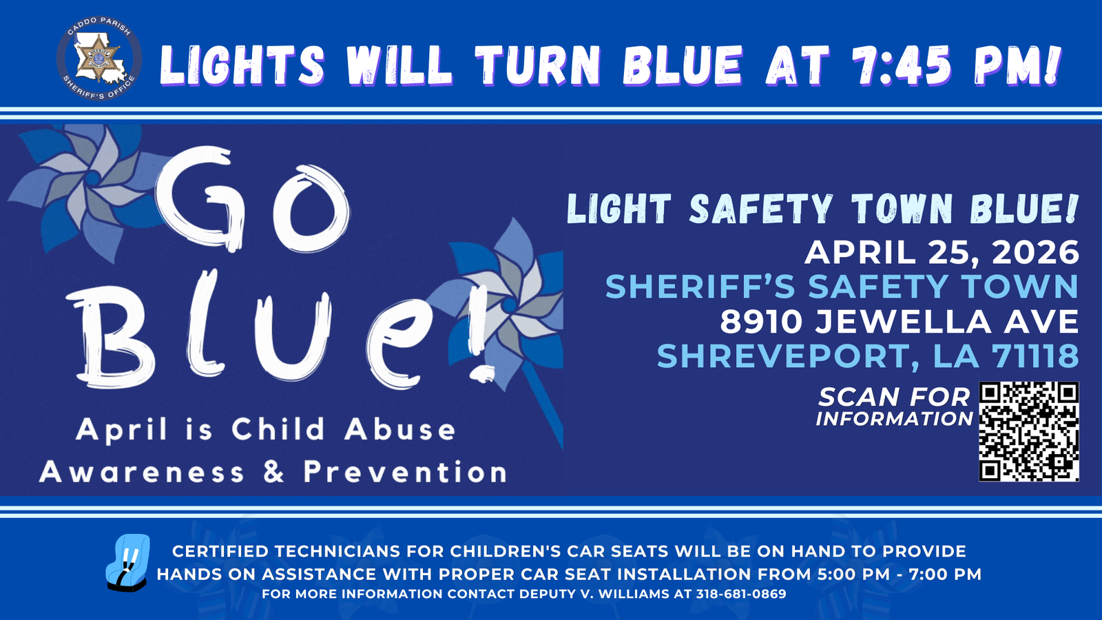 The Caddo Parish Sheriff's Office invites the community to a special event, "Light Safety Town Blue," in recognition of Child Abuse Awareness Month.