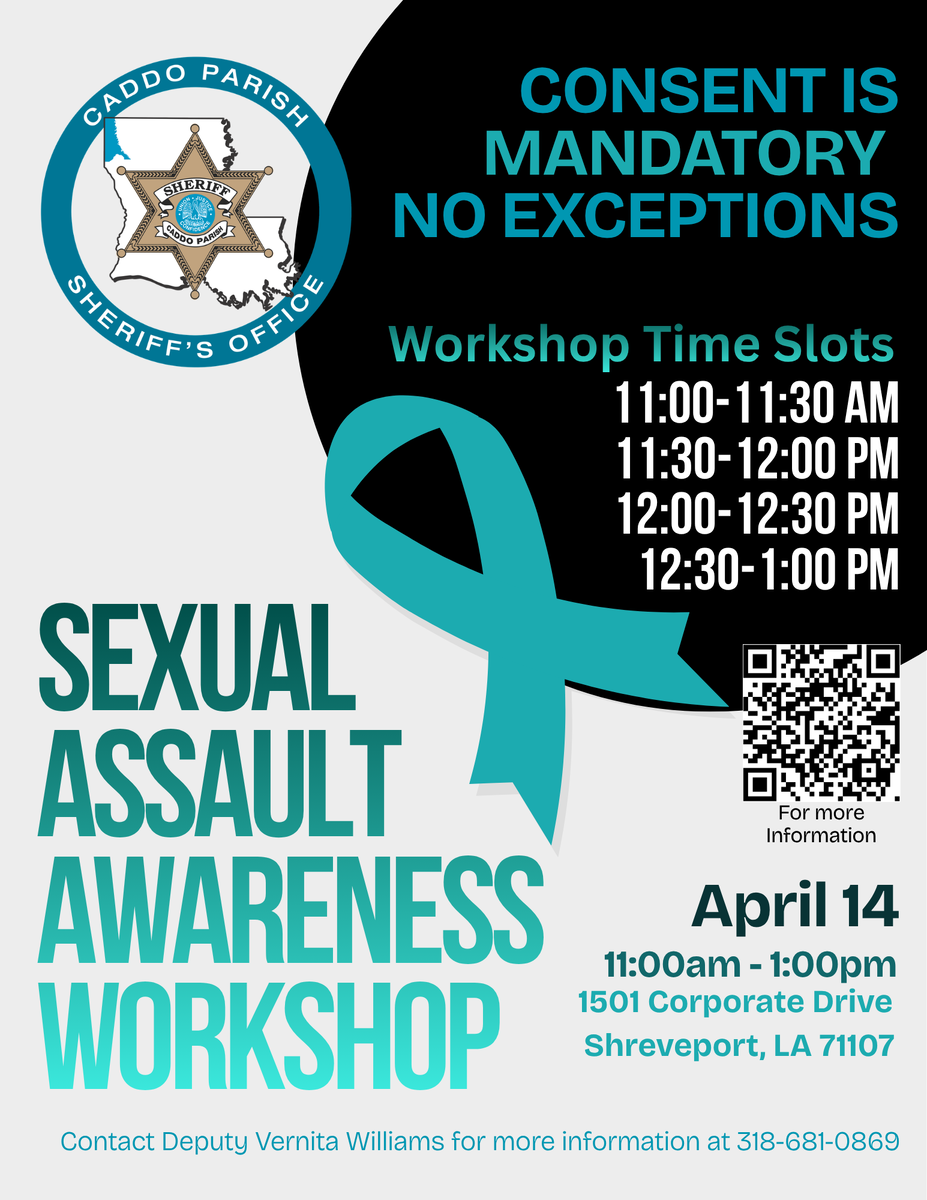 The Caddo Parish Sheriff's Office is hosting a Sexual Assault Awareness Workshop aimed at raising awareness about sexual assault, educating participants on prevention strategies, and connecting community members with valuable local resources. The workshop will take place at 1501 Corporate Drive on April 14, from 11:00 a.m. to 1:00 p.m.