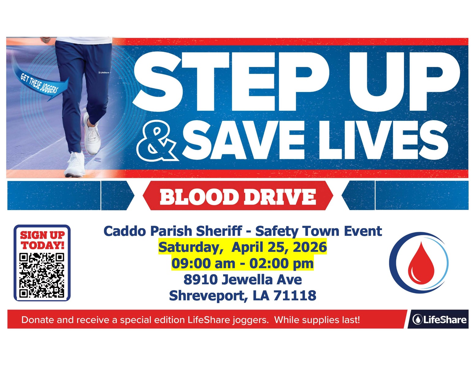 The Caddo Sheriff's Office is hosting a blood drive on Saturday, April 25, from 9:00 AM to 2:00 PM at the Sheriff's Safety Town, located at 8910 Jewella Avenue, Shreveport, LA. Lifeshare will have their donor bus on-site. If you are able, please stop by to donate. Our goal for this drive is to collect 15 donations. Thank you!