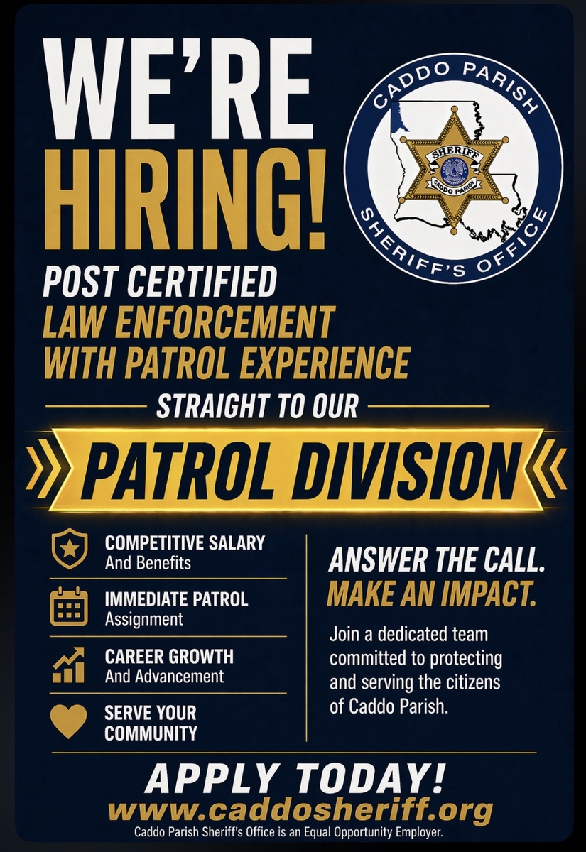 The Caddo Parish Sheriff's Office is currently seeking experienced law enforcement professionals to join our Patrol Division.