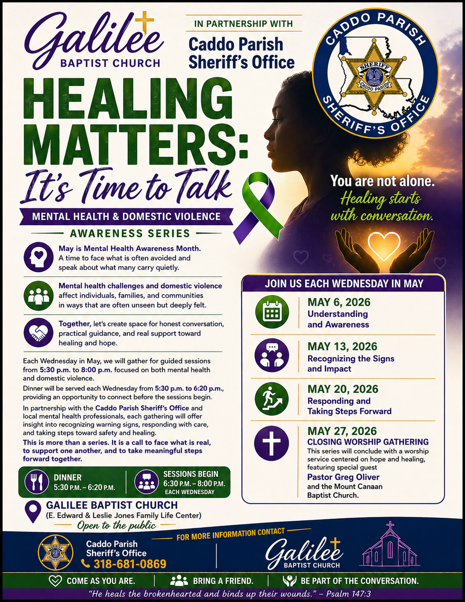 In recognition of Mental Health Awareness Month, the Caddo Parish Sheriff’s Office is partnering with Galilee Baptist Church to support a month-long community initiative focused on mental health and domestic violence awareness. The series, titled Healing Matters: It’s Time to Talk, will take place each Wednesday in May and is designed to connect residents with resources and support systems.